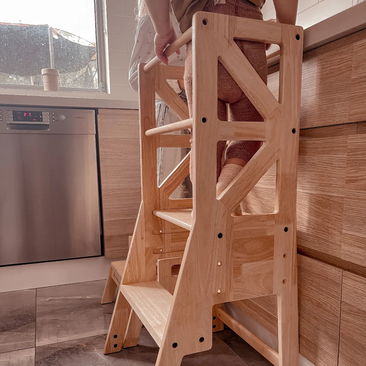 Our Kitchen Tower is perfectly designed for every family. It encourages your kids to play, learn and assist you in the kitchen and keep them busy and safe by your side.