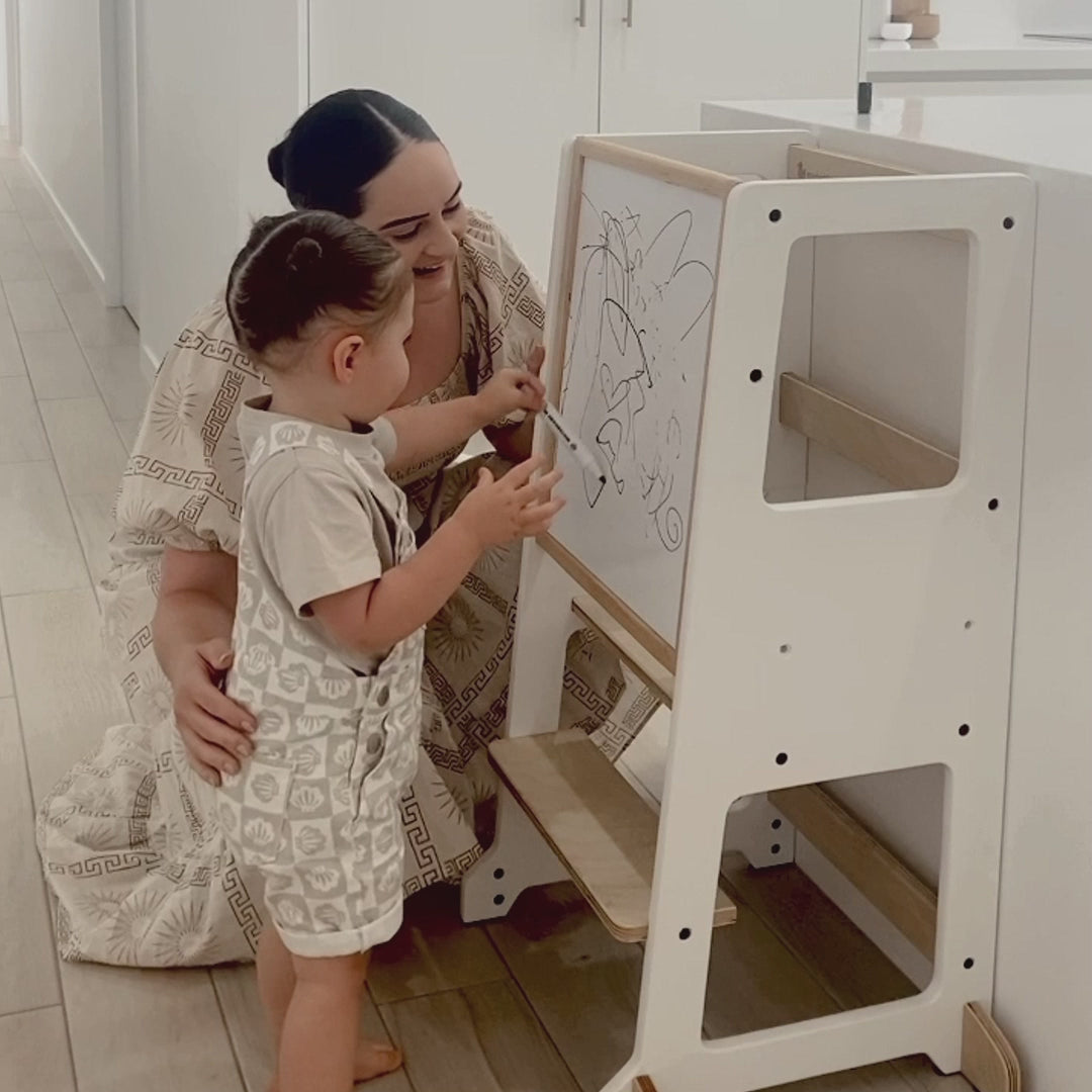 My Duckling LOLA Adjustable Kitchen Tower features two platform heights to support your child's growth and includes a removable magnetic drawing board for various activities.