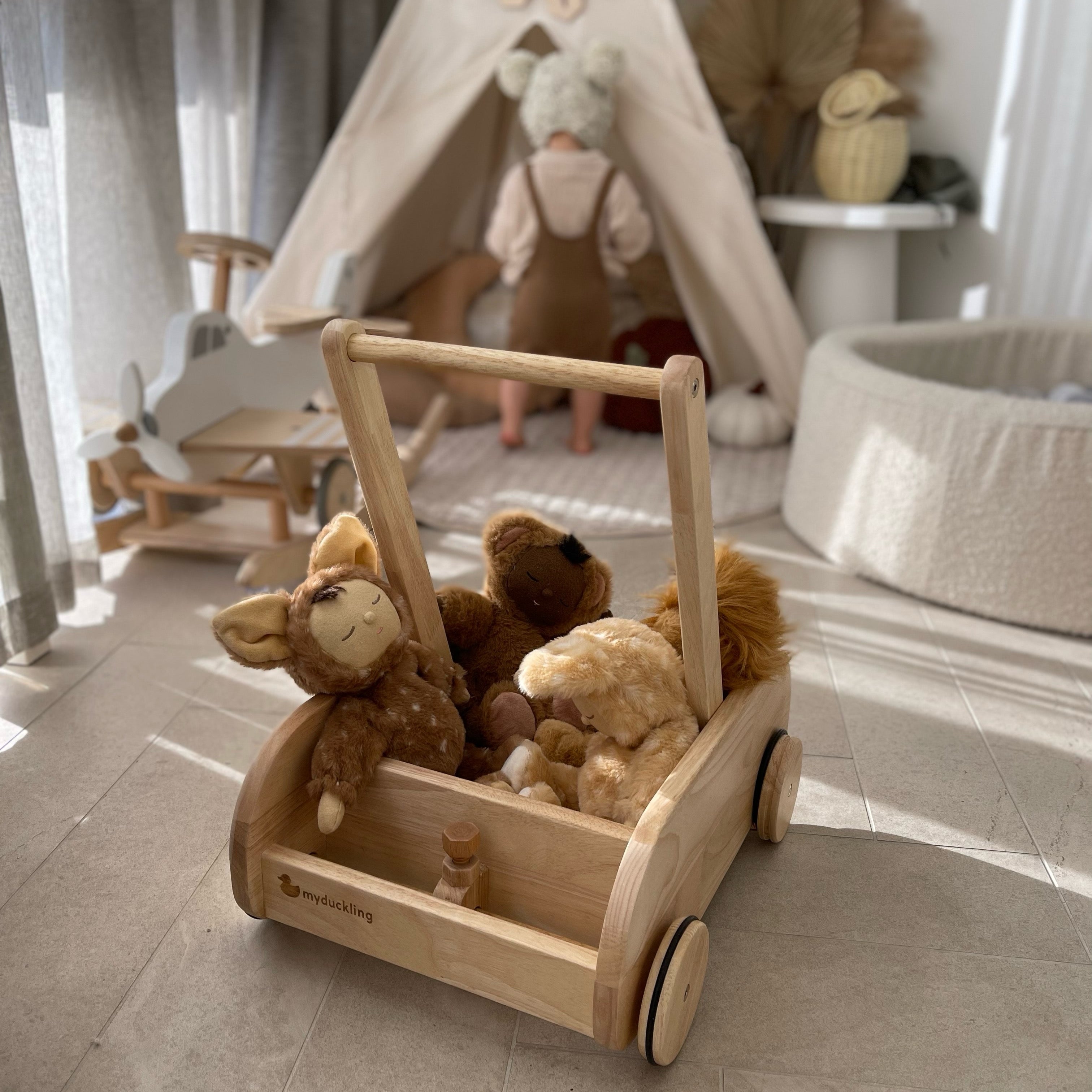 My Duckling Wooden Baby Walker is designed to accompany your little one on their exciting journey of first steps and exploration. Crafted with love and care, this wooden walker wagon is not just a toy but a trusted companion for your baby's early development.